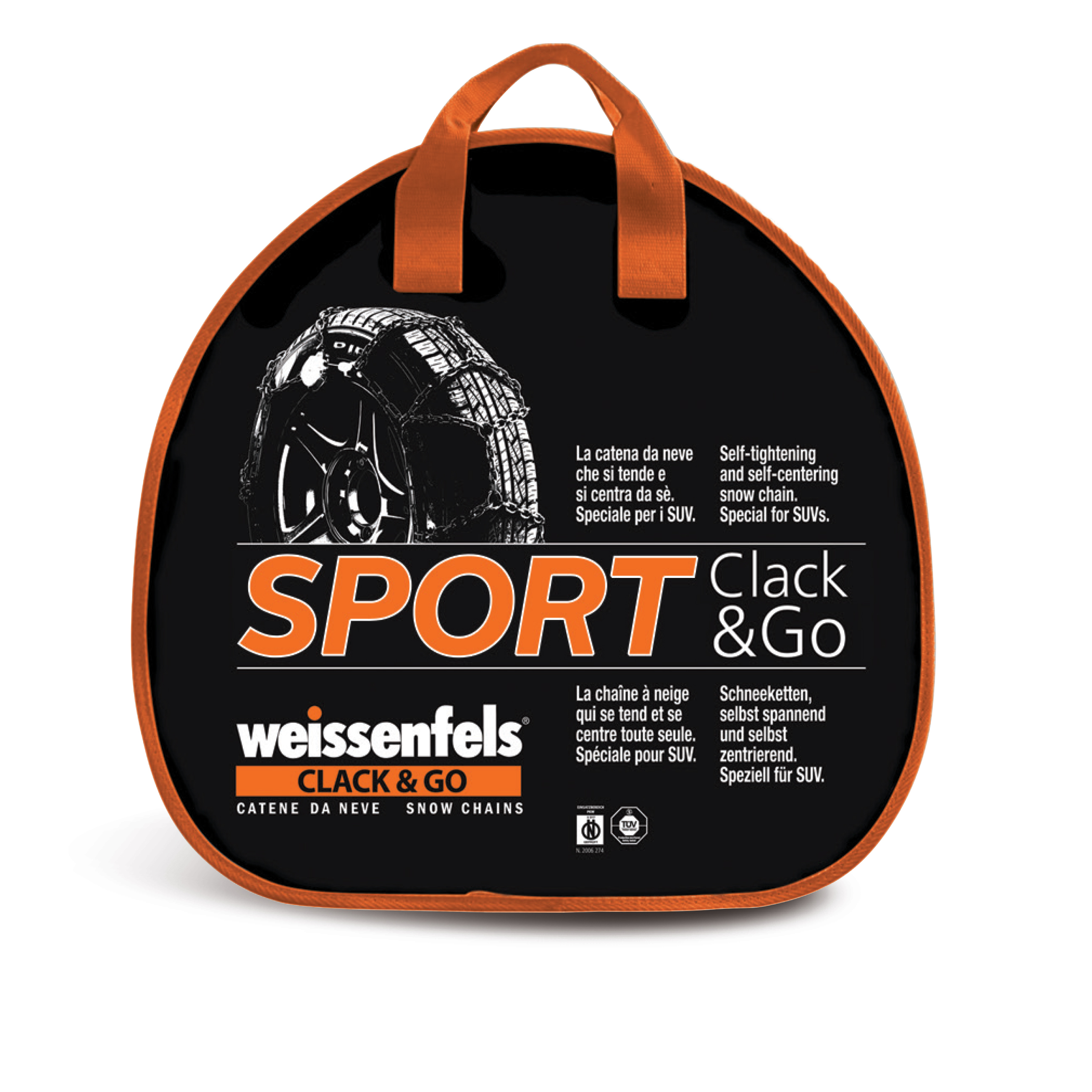 Chain created for the compact SUV generation. Automatic centring and tensioning by means of an automatic ratchet. Without any parts that cut across the rim.