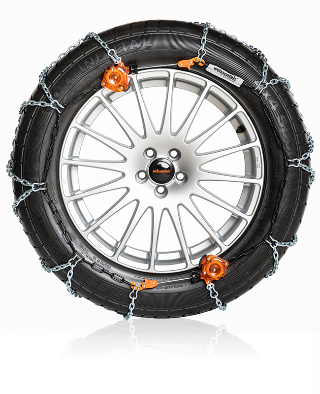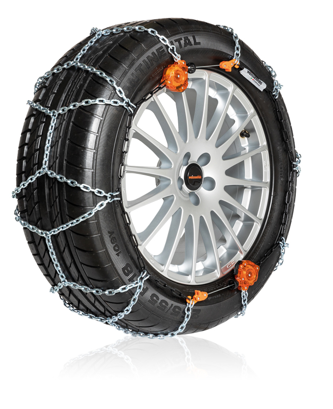 Chain created for the SUV generation. Automatic centring and tensioning by means of two automatic ratchets. Without any parts that cut across the rim.